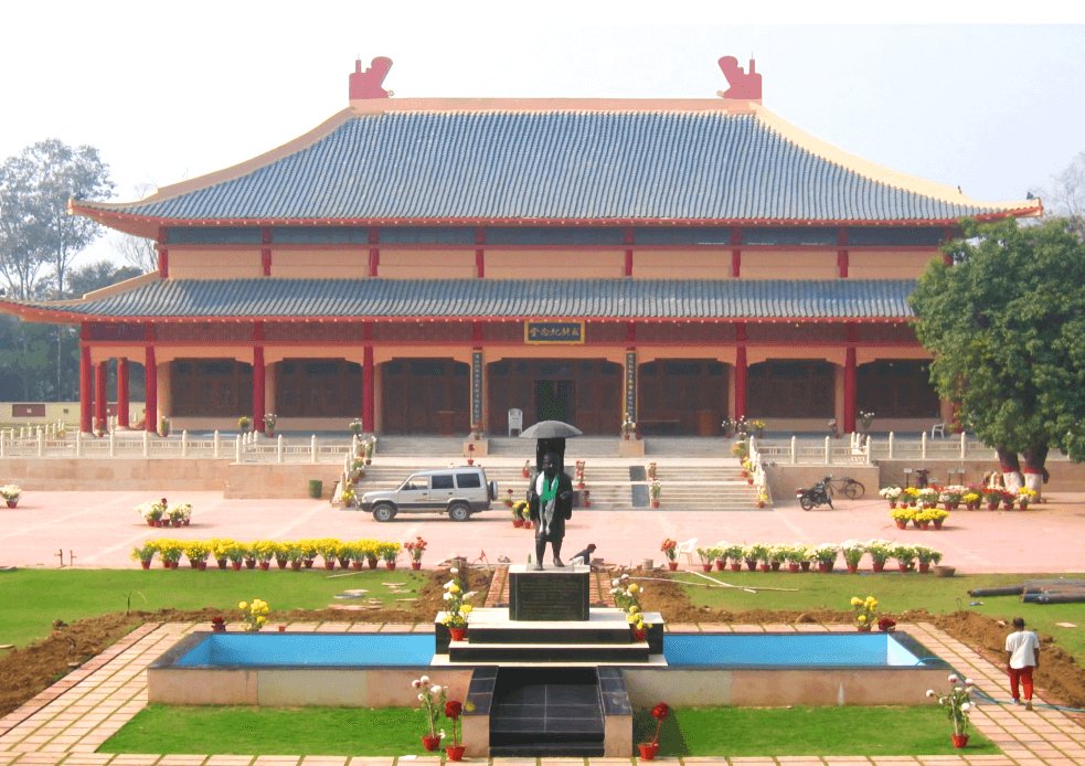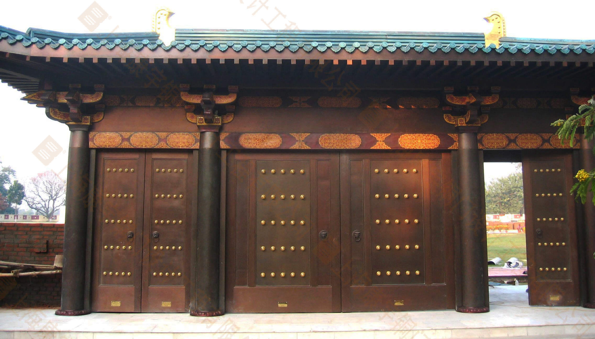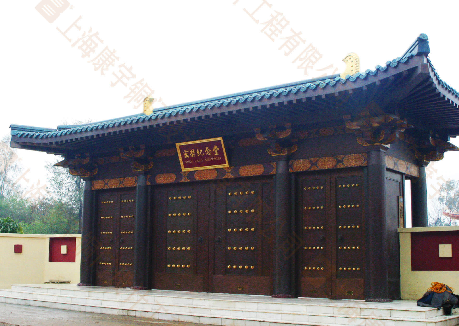 玄奘紀(jì)念館依據(jù)中國唐代風(fēng)格設(shè)計(jì),總高度6.4米,長10米,深4米,門樓的層面系統(tǒng)全部采用銅瓦裝飾,表面仿青銅色澤處理,門樓的8組抖拱,全部采用銅制成,并采用傳統(tǒng)的景泰藍(lán)工藝裝飾。