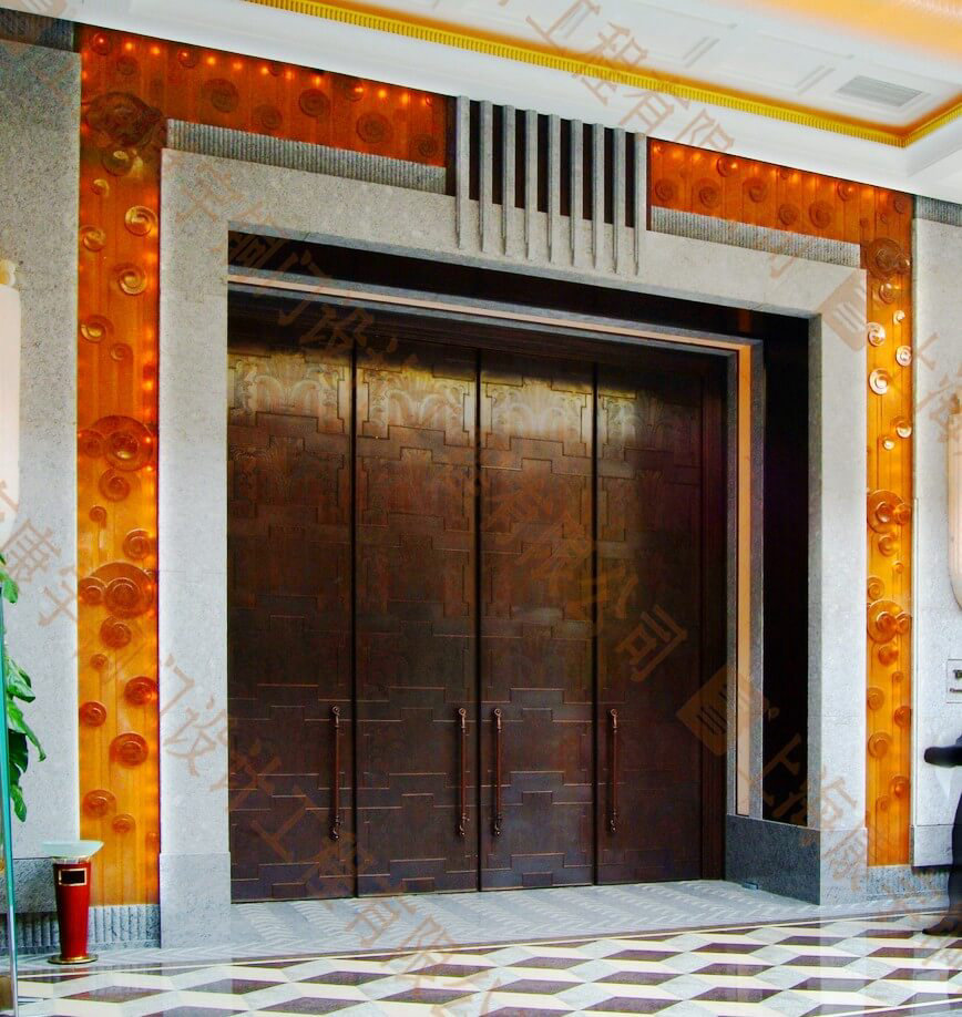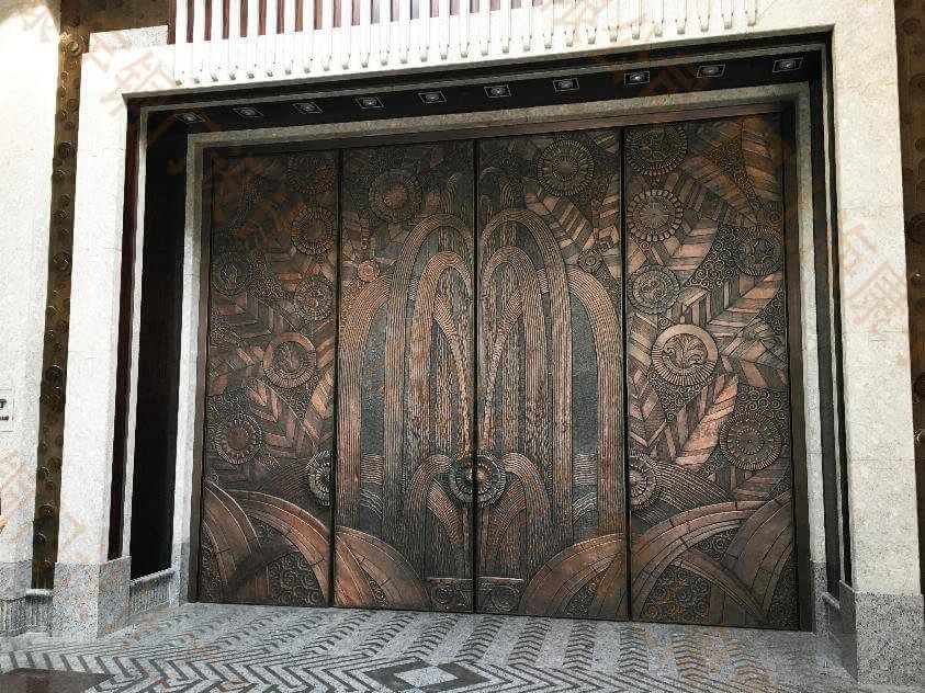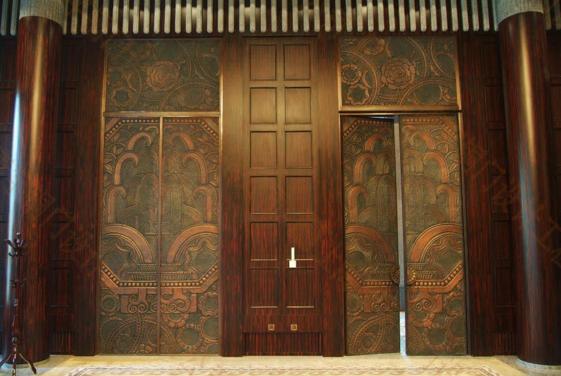 上海西郊賓館是花園式國賓館,占地1160畝,西郊會議中心位于西郊賓館內,整體風格為裝飾主義風格。銅作為其主要的運用材質和工藝,大面積使用在銅門、旋轉門、窗、衛浴、裝飾件等部位,凸顯建筑的地域性風格。其中純手工打造的宴會廳門。?
