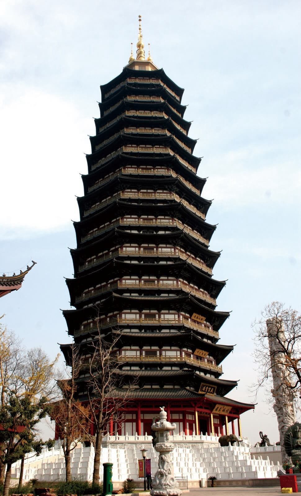 常州天寧寺金屬寶塔,采用唐宋樓閣式結構,呈八角型布局,共13層,總高153.79米,寶塔巍峨壯觀。