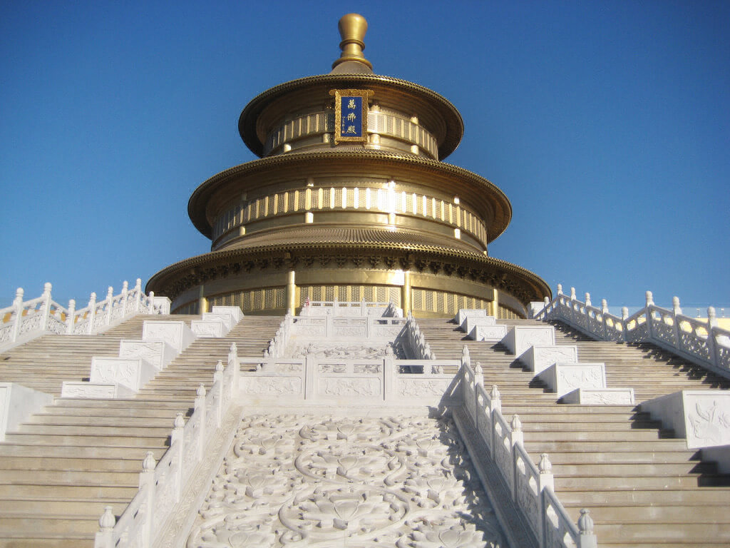山東慶云海島金山寺萬佛殿,依據(jù)是北京天壇祈年殿風(fēng)格建設(shè),高60米。